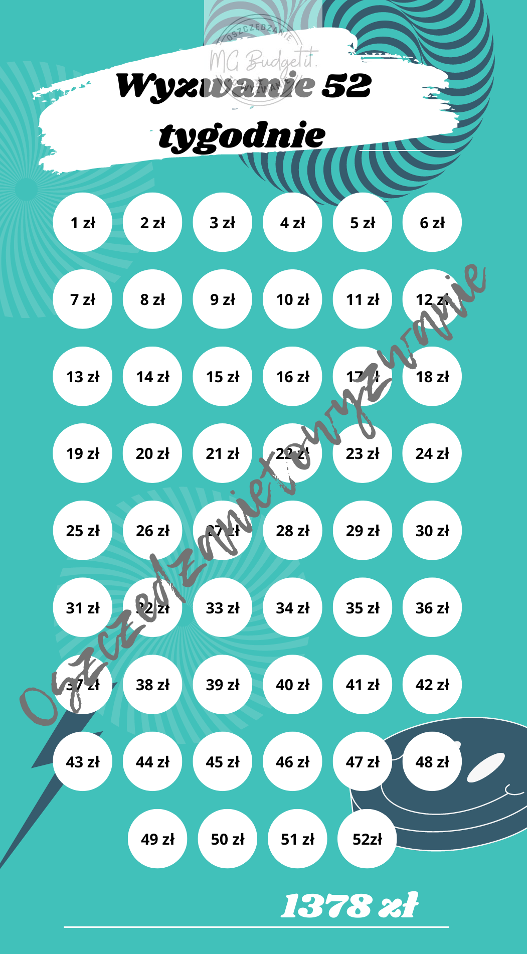 To wyzwanie nie pozwala nam zapomnieć, że oszczędzać trzeba na każdym kroku. Co tydzień odkładamy wybraną kwotę, aby po roku mieć naprawdę odczuwalną sumę. Świetna motywacja i przyjemna nagroda na koniec. Polecam!